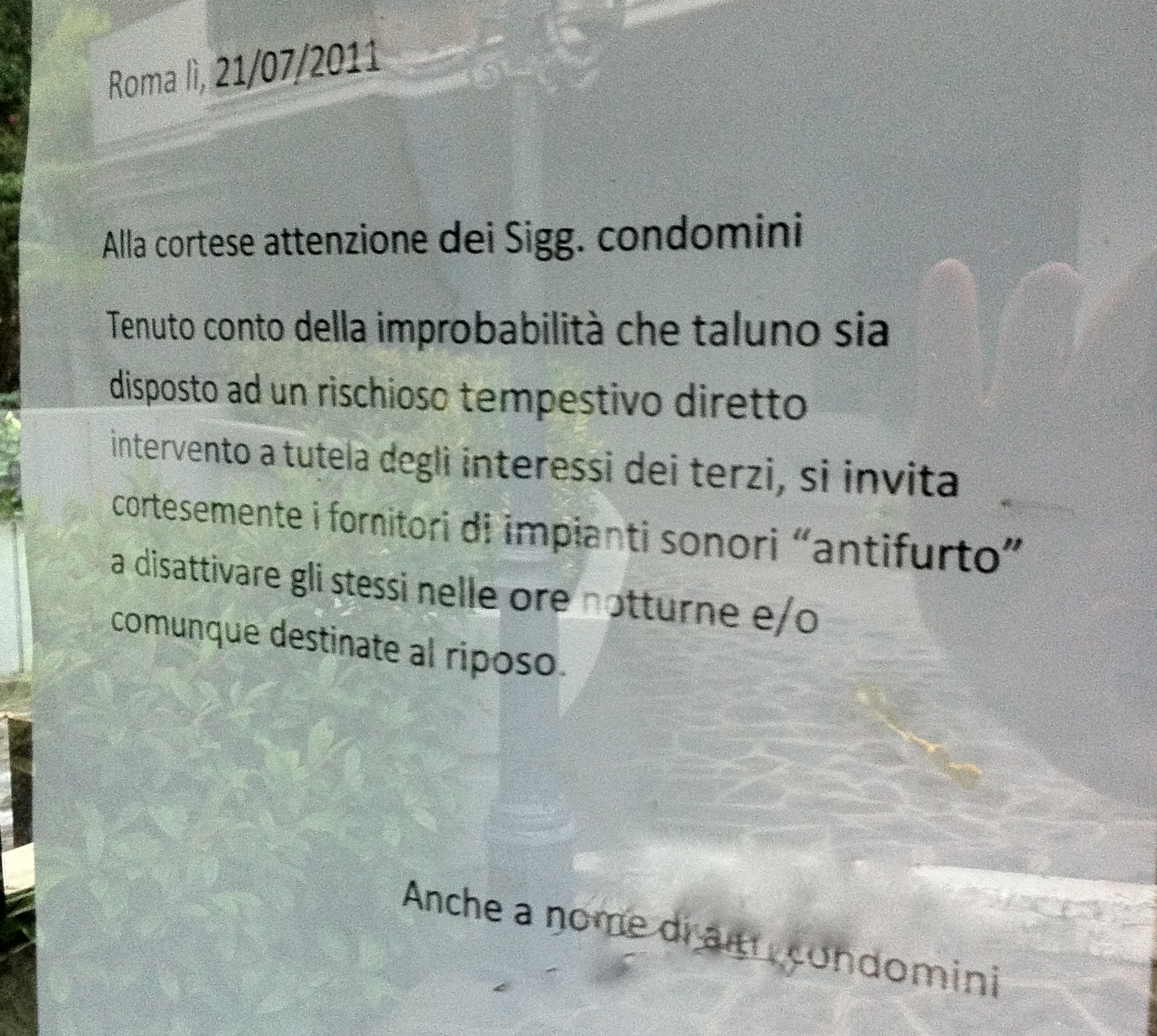 Condomini estivi e allarmi notturni. La prosa di un avviso. “Tenuto conto della improbabilità …”. Leggilo tutto. Geniale. » Esasperato dagli allarmi notturni, ecco l’avviso geniale e cinico di un condomino.