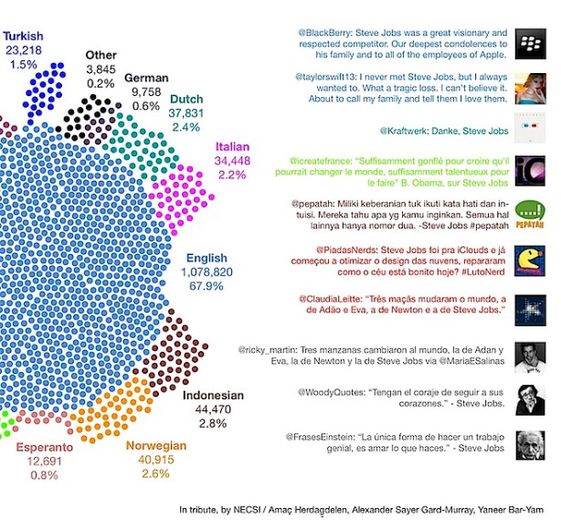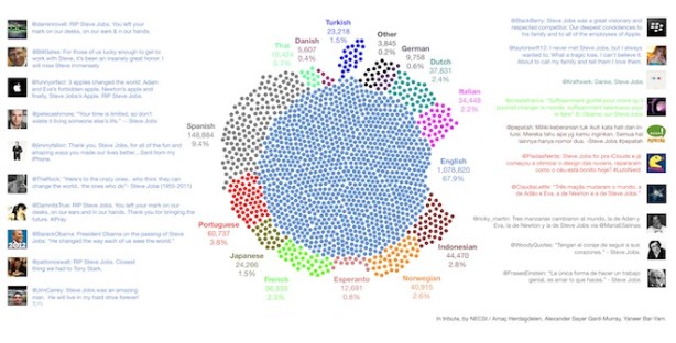 Rather than focusing on network dynamics, they decided to analyze the tributes by language. Jobs wasn’t just an American visionary, but truly global.