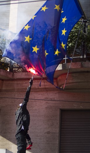 La bandiera europea bruciata dai black bloc a Roma il 15 ottobre