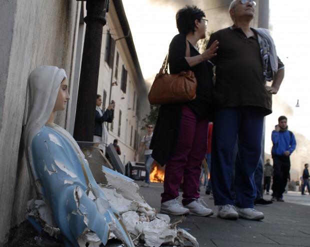 Black bloc a Roma con gli indignados. Frantumano una statua della Madonna e bruciano la bandiera italiana. Due immagini di una giornata infernale » La statua della Madonna frantumata dai black bloc il 15 ottobre