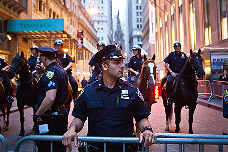 NEW YORK, NY - OCTOBER 15: Police keep watch as demonstrators associated with the 'Occupy Wall Street' movement protest in Times Square on October 15, 2011 in New York City. Thousands of people are taking to the streets in cities across the world today in demonstrations inspired by the 'Occupy Wall Street' protests against the global financial system that began here in New York. (Photo by Mario Tama/Getty Images)