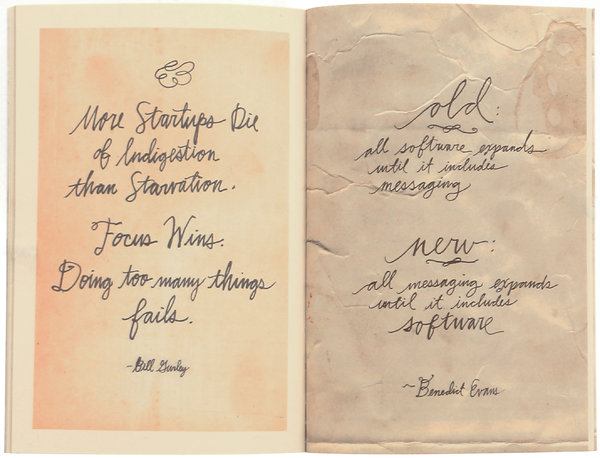 He leaves behind scattered writing, including lovingly handwritten reproductions of tweets from the real feeds of some of Silicon Valley’s most powerful investors, including Brad Feld (“Reminder to self: Not happy with game? Change the game”) and Paul Graham (“If you try to outlaw the future it will just happen somewhere else”).