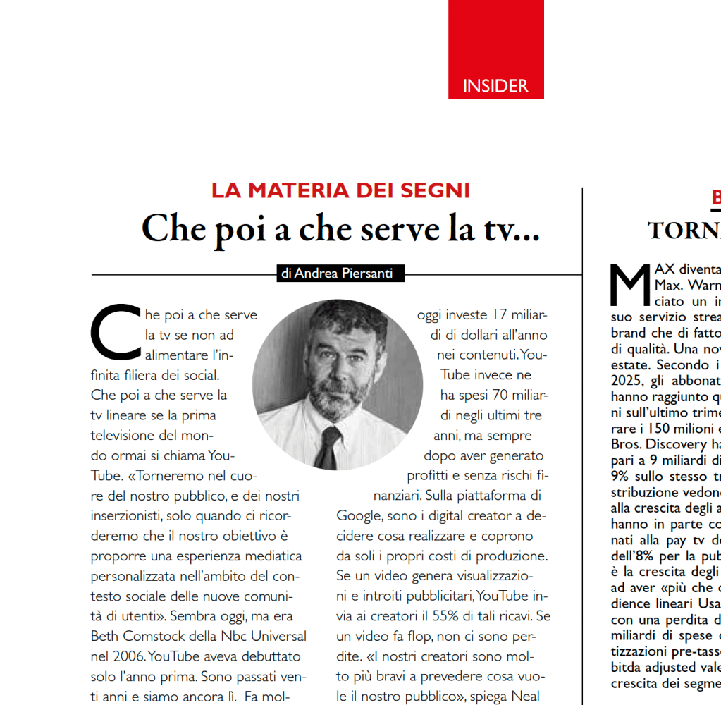Che poi a che serve la tv se non ad alimentare l’infinita filiera dei social. Che poi a che serve la tv lineare se la prima televisione del mondo ormai si chiama YouTube.