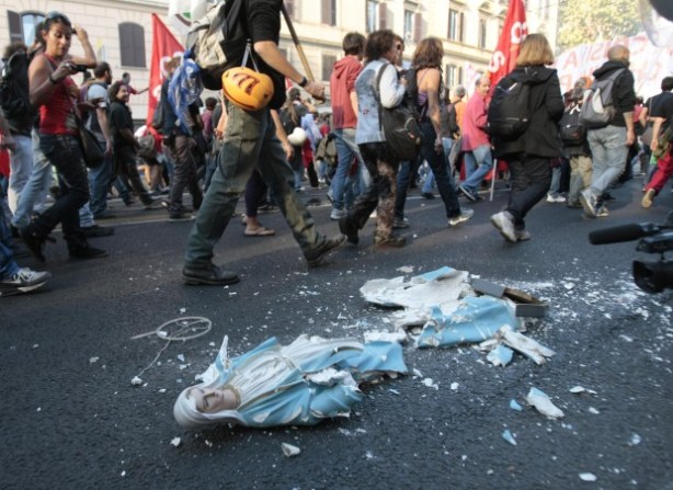 Black bloc a Roma con gli indignados. Frantumano una statua della Madonna e bruciano la bandiera italiana. Due immagini di una giornata infernale
