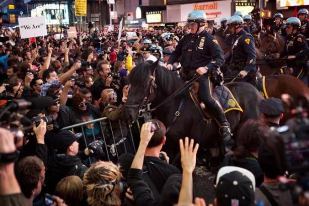 Mounted police officers push into crowds of Occupy Wall Street protestors in Times Square the day after the demonstrators successfully resisted a potential eviction from their camp in Zuccotti Park, Saturday, Oct. 15, 2011, in New York. Thousands of demonstrators protesting corporate greed filled Times Square on Saturday night, mixing with gawkers, Broadway showgoers, tourists and police to create a chaotic scene in the midst of Manhattan. (AP Photo/John Minchillo)